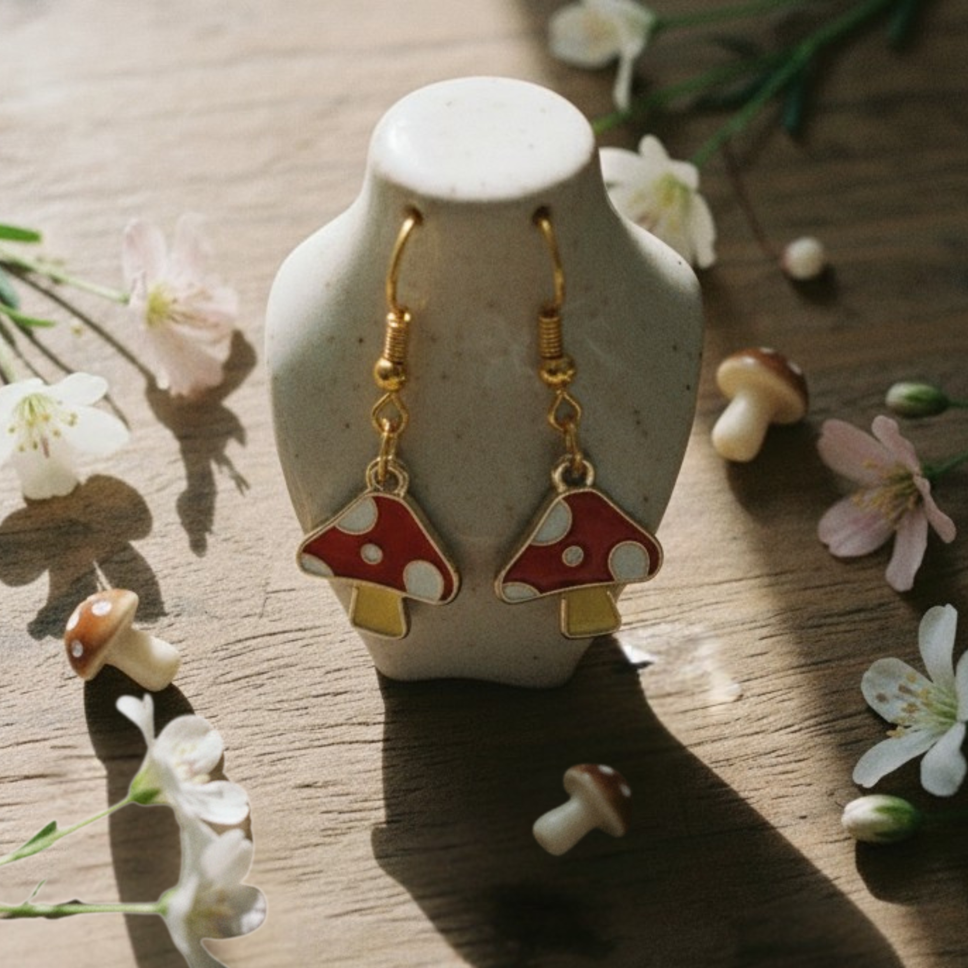 These Mushroom Dangle Earrings are crafted from 15mm alloy and enamel charms that hang from golden hooks. Approximately 1.4" in length.